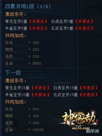 神话中四灵神兽都有着移山填海呼、风唤雨的能力,而在51《神仙劫》中四灵也有着自己的圣灵技能。当当魂力值达到规定数值,可以激活圣灵技能。每个圣灵都有初级与高级两个技能。激活技能后,每增加一定的魂力值,可以升级一次圣灵技能。当4个属性系统(青龙、白虎、朱雀、玄武)都升到一定的重数,可以激活四象共鸣属性加成,激活后为1级;持续升级4个系统的重数则持续获得属性加成。