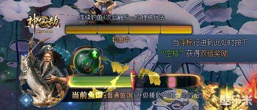 当玩家处于钓鱼区域时点击钓鱼开始钓鱼,钓鱼进度随时间增加,钓鱼进度达到100%时本次钓鱼成功,且每四次普通玩法出发一次特殊玩法,奖励翻倍!当然你也可以消耗一定的元宝获得次次奖励翻倍的道具。