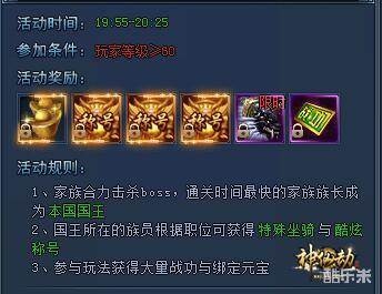 国王竞速是家族活动必不可少的需要参加的活动,满60级的玩家在每周二、周五的19:55-20:25这个时间段可以参与竞速。每周两天,一个时间段,关乎家族荣誉名望的时刻,岂能错过?国王竞速其实就是一个家族合力击杀BOSS的活动,详细规则容我慢慢述说。