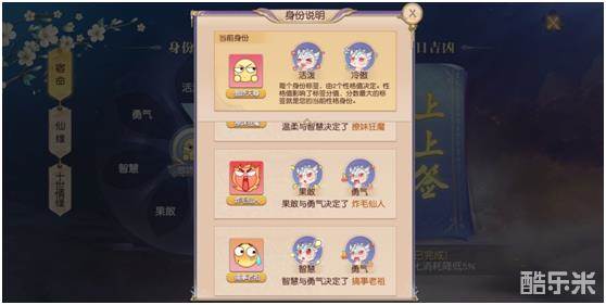 大家根据剧情,可以选择以不同的方式回答对话内容,每个选择都在记录大家的性格变化,如下图可以以活泼和温柔的方式回答,活泼和温柔就是两个性格值,除此之外,还有冷傲、勇气、智慧、果敢、沉稳性格值,2个性格值决定了玩家的身份标签(就是性格)。