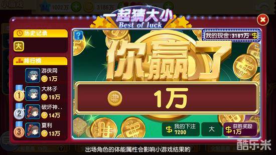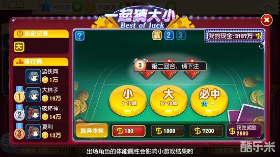 猜大小顾名思义,一共3个骰子,3-10点为小,11-18点为大。
