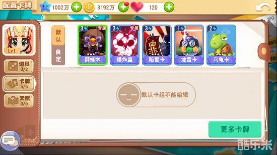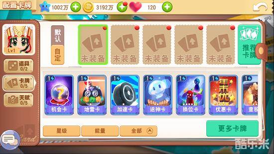 在大富翁9手游中,我们可以看到每个角色可佩戴5张卡牌。不同的角色有属于他自己的默认卡组。