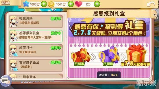 2.感恩报到礼盒:第2.7.8天登陆,立即领取,可获得2个角色。