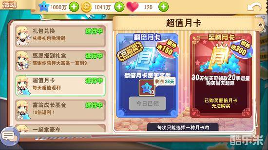 3.超值月卡:每月可购买翻倍月卡或至尊月卡,可领取幸运星。