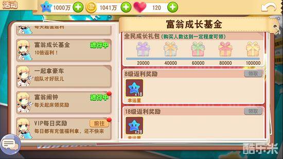 4.富翁成长基金:购买基金,等级越高可返还幸运星越多。