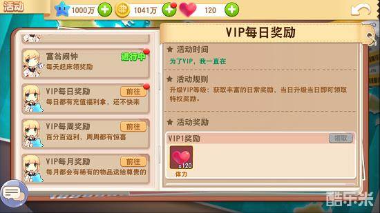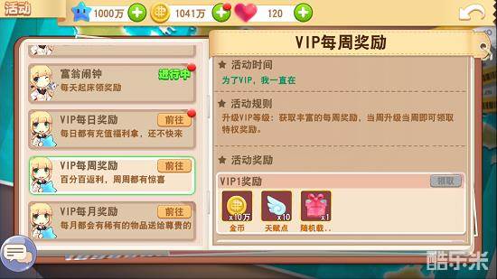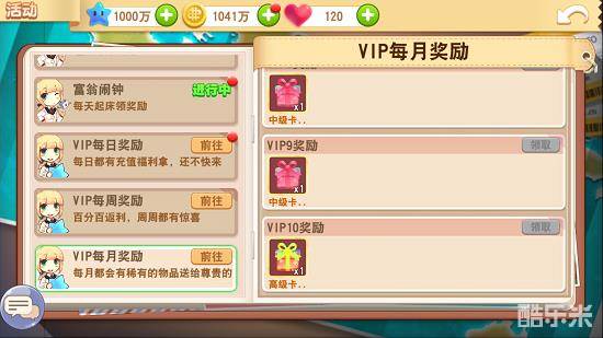 7.VIP奖励:升级VIP等级.每日每周每月均有不同奖励。