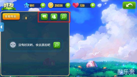 进入好友系统界面:左上方三个绿色按键,作用分别是【已加好友】【好友申请】【添加好友】
