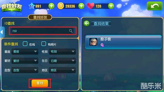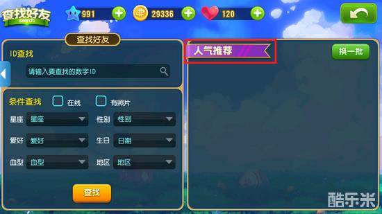 如果你并不知道好友ID,而是想随机添加好友。在右侧会有人气玩家推荐。想要拥有高人气网红玩家做朋友的各位可以试试这一功能啦~而且好友系统还提供了非常人性化的条件查找,你可以通过输入星座、爱好、性别等条件进行筛选哦~满足你的一切需求~