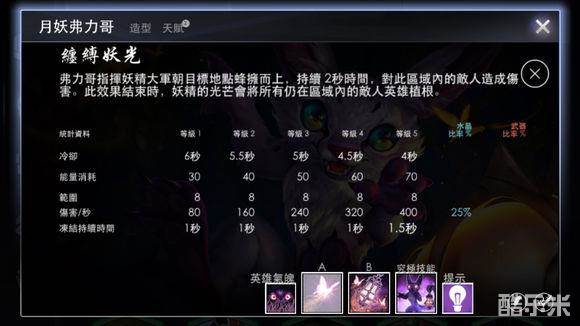 1技能是一个小范围的AOE伤害,而且最后还在这个范围内的生物都会被禁锢(渔人 暗爪 魔翼 克拉肯除外),别小看这个技能 可以说是小精灵的核心技能 线上poke消耗的主要手段单单是0ap的境况下点满就有800伤害 而且还有1.5s的禁锢,4s加上减冷却大概就2.7s一个1技能 真的很强