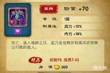 这件甲级装备比较适合输出类型的弟子,在搭配比较好的武器可以让这和弟子的杀伤力提升一个档次,让弱小的弟子瞬间就能变成高富帅。