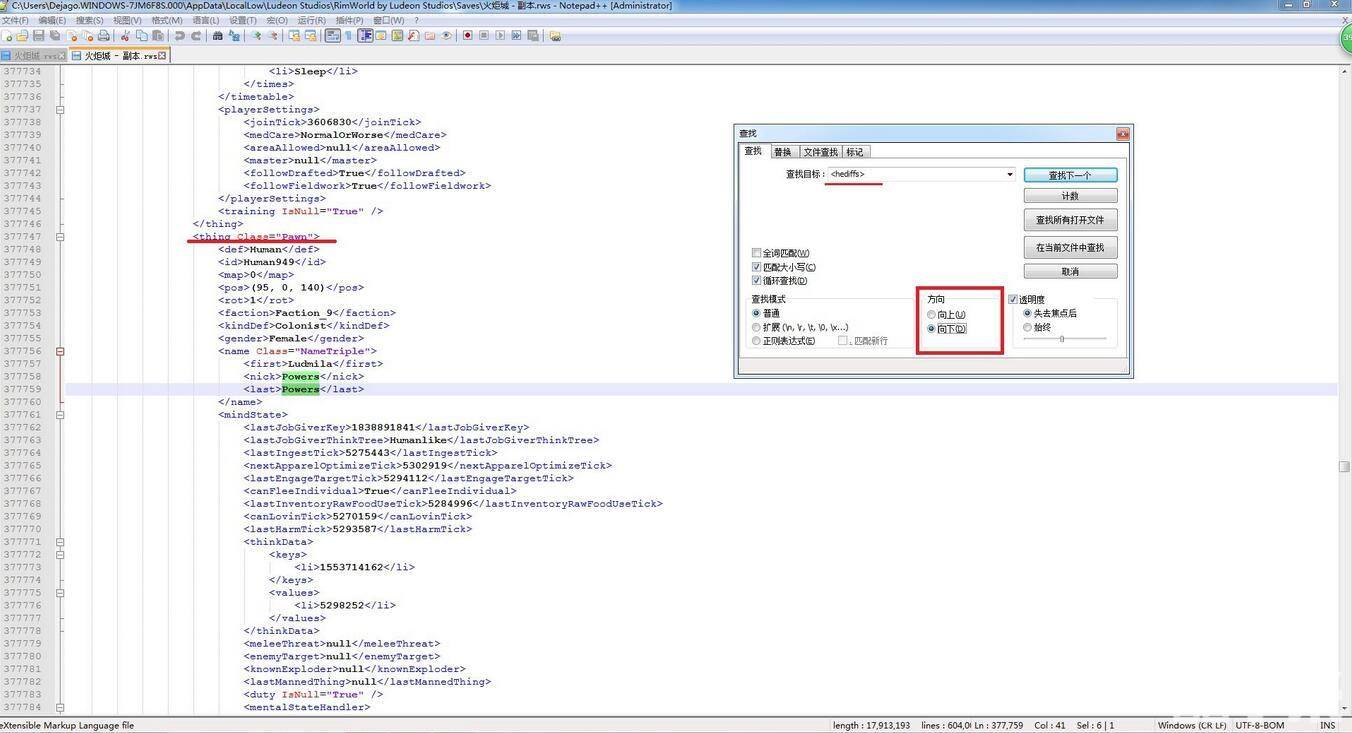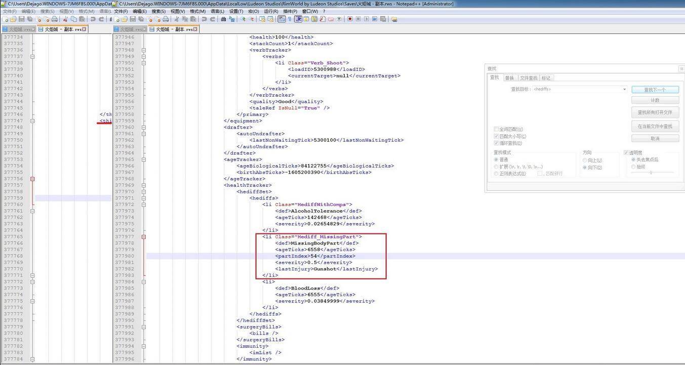 找到之后把框里的内容删掉就可以了。注意一定是从一个<li>到</li>,漏删哪怕一个括号都可能让存档无法读取。这里的MissingBodyPart就是身体缺失了,如果你看得懂的话就可以照猫画虎了。def是状态类型;agetick意义不明,貌似不是持续时间;partIndex是伤痛所在部位具体每个部位对应的数字是多少,应该有文件可以查;severity是痛苦值;lastInjury是最后造成这个伤的伤害类型。