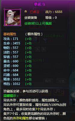 除了基本的坐骑之外,游戏中还有许多珍藏版坐骑外形,比如神兽草泥马可以在活动中兑换获得。