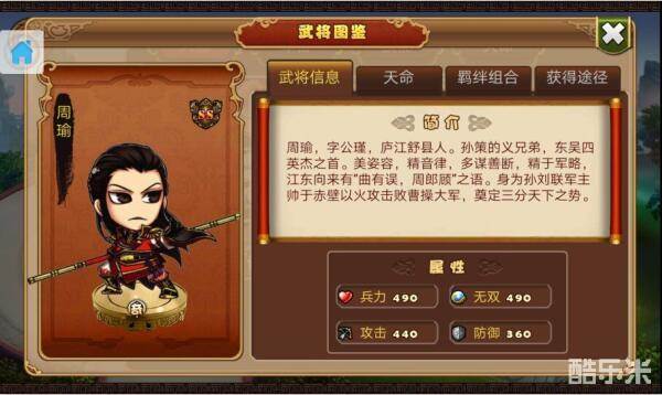 羁绊组合介绍:小乔+周瑜同时上阵可触发“琴瑟和鸣”,可提升兵力20%;与诸葛亮、司马懿同时上阵可触发“鬼神之计”,提升无双20%;与陆逊、鲁肃、吕蒙同时上阵可触发“江东都督”,提升攻击力20%。