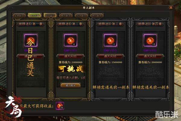 萌乐网《天局》中,玩家开启翅膀系统后即可在个人副本当中选择进入难度不同的翅膀材料副本。翅膀材料副本当中每个章节每天可以挑战一次,想要解锁下一章节就必须先通关上个章节。每个章节难度不断递增,所以通关所需的战斗力也不断提高。进入副本后玩家击杀所有小怪与BOSS才算通关副本。