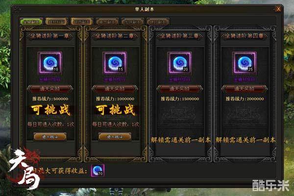 萌乐网《天局》当中,玩家可以参与的第一个副本就是坐骑副本。坐骑副本当中每个章节每天可以挑战一次,想要解锁下一章节就必须先通关上个章节。每个章节难度不断递增,所以通关所需的战斗力也不断提高。进入副本后玩家需要先清理小怪然后击败BOSS才算通关,如果对于自己的战斗力没有信心,一定要量力而为哦。