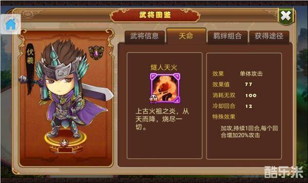 伏羲在《乱世争锋》中为步职业甲级武将,天命技“燧人天火”,令上古火祖之炎从天而降,烧尽一切,强大的单体攻击令敌人胆寒!当其与女娲娘娘同时上阵时,将会触发“三皇其二”的羁绊,增强防御力。伏羲兵力属性、防御属性都相对较高,适合占据中前排的位置,攻击力不弱的他,是一个能打能抗的英雄,上阵时一定要发挥出他的长处哦!这么一个大神,千万不要把他玩坏了!