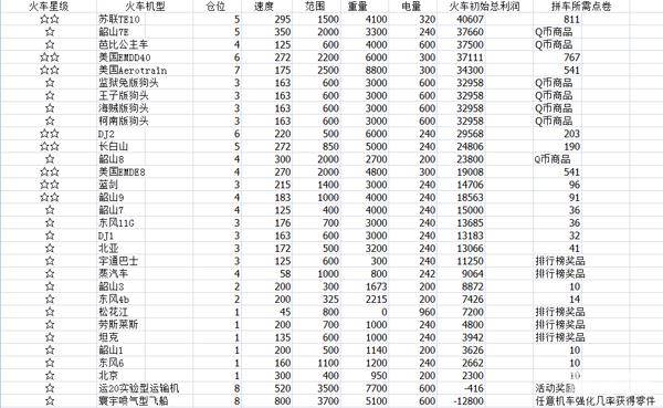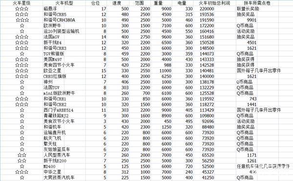 下面是由玩家整理的中华铁路利润数据表,不过小编发现普通版的TGV利润好像不对,另外欧洲野牛是1星的。