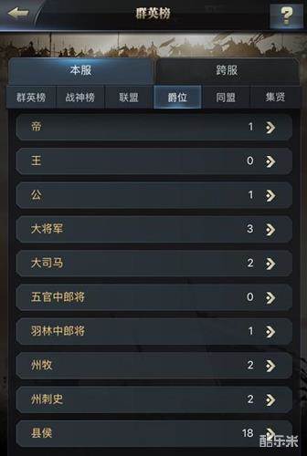 各位主公可以在游戏界面打开“群英榜”,在“爵位”一栏可以看到,所有爵位从低到高分别为:县侯、州刺史、州牧、羽林中郎将、五官中郎将、大司马、大将军、公、王和帝。其中,在本区服成功占领洛阳王城的联盟,称帝创建王朝后,其盟主即可获得“帝”的爵位。爵位和势力值是体现主公和所在联盟实力强弱的重要标准。盟主拥有更高的爵位后,联盟将解锁更多的爵位官职,即可任命联盟成员,获得带兵数加成效果。