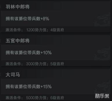 在总共的十个爵位中,除了“帝”这个唯一的爵位之外,其他爵位均有势力值要求,并且需要达到对应的首府要求。也就是说,联盟需要在达到势力值要求的情况下,攻陷对应等级的城池作为首府才可以解锁该爵位。加成中的带兵数加成指的是出征军团中每个主将的带兵数加成,并且与军事府的等级相关。