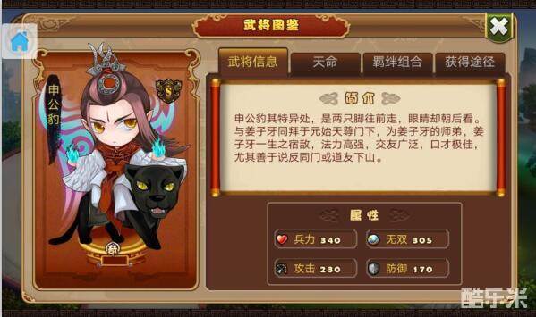 当申公豹与太公望同时上阵时,会触发“终身之敌”羁绊,增强攻击属性;与妲己同上阵会触发“故人之助”羁绊,提升兵力属性,从这一点来看,申公豹是前期比较容易搭配阵容的英雄,因为与他有羁绊的英雄是比较容易获得的蓝色A级英雄,搭配的难度相对会低一些。