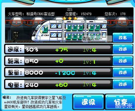 QQ中华铁路火车有4项基本属性,分别为速度、距离、重量和电量。左边白色的部分为初始属性,如下图中初始速度为303,中间显示的是经过改进后的属性,如下图中速度为75,刚组装或购买时为0,右边lv表示的是当前属性改进后的等级,如下图中速度改进等级为4,初始等级为1.