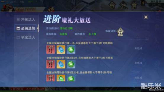 坐骑等阶排行第6至20名 且坐骑等阶大于3阶 | 六阶2星红装靴子*1、坐骑资质丹*1、猫宠进阶丹*20 |