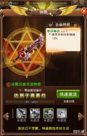 耀金神器:增加怪物金币的掉落;银魂神器:增加怪物银币的掉落;心动神器:击杀BOSS获得的灵石数量增加;圣皇神器:佣兵大招冷却缩减;冥王神器:受到伤害减少10%。激活条件也不尽相同,比如达到一定关卡数;累计登陆多少天;爵位达到多少档次;累计多少商城积分等。
