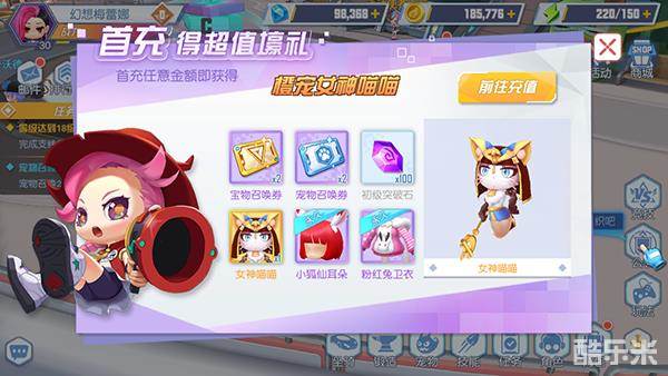 首充任意金额即可活动橙宠女神喵喵*1,宝物召唤券*2、宠物召唤券*2、永久时装*2、初级突破石*100