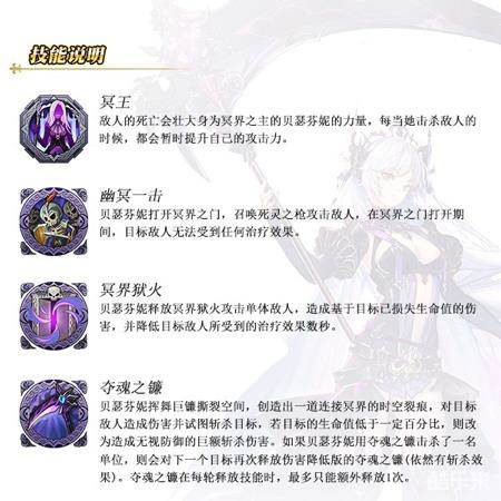 而贝瑟芬妮的主动技能有三个,一技能是幽冥一击——贝瑟芬妮打开冥界之门,召唤死灵之枪攻击敌人,在冥界之门打开期间,目标敌人无法受到任何治疗效果;二技能是冥界狱火,即贝瑟芬妮释放冥界狱火攻击单体敌人,造成基于目标已损失生命值的伤害,并降低目标敌人所受到的治疗效果数秒。三技能则显得尤为霸气,为夺魂之镰,当贝瑟芬妮挥舞巨镰撕裂空间,创造出一道连接冥界的时空裂痕,对目标敌人造成伤害并试图斩杀目标,若目标的生命值低于一定百分比,则改为造成无视防御的巨额斩杀伤害。如果贝瑟芬妮用夺魂之镰击杀了一名单位,则会对下一个目标再次释放伤害降低版的夺魂之镰(依然有斩杀效果)。夺魂之镰在每轮释放技能时,最多只能额外释放1次。