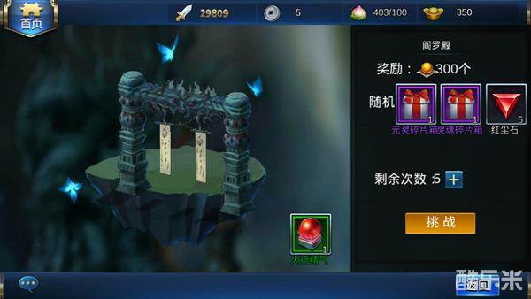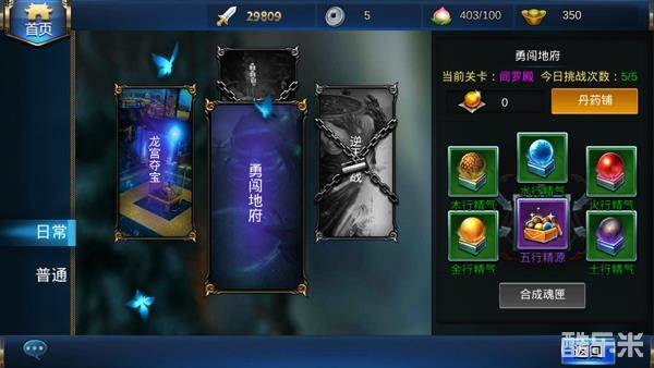 “勇闯地府”玩法共包含五个随机地图,每天打开勇闯地府界面,将会随机获得一个地图入口。每张地图战斗完成后,可获得属性精气,五张地图分别对应“金木水火土”五个属性。