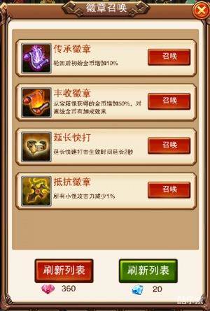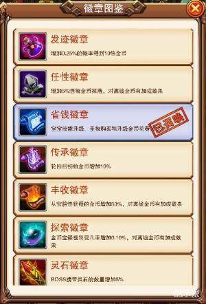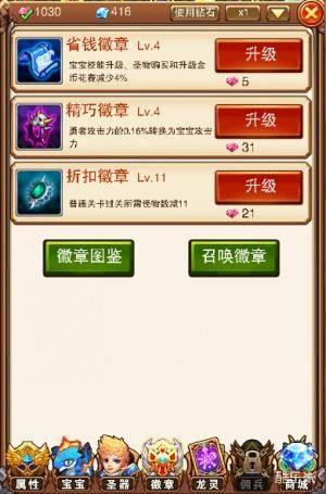 据不完全统计,徽章总共多达36种,如何挑选有助于闯关的徽章尤为重要:折扣徽章首当其冲,升级折扣徽章可以减少普通关卡过关所需的怪物数。其次是省钱徽章,召唤之后,宝宝技能、圣物购买升级的花费都将大幅度减少。徽章的升级和召唤同理,都是依靠勇者之心和钻石来完成的。