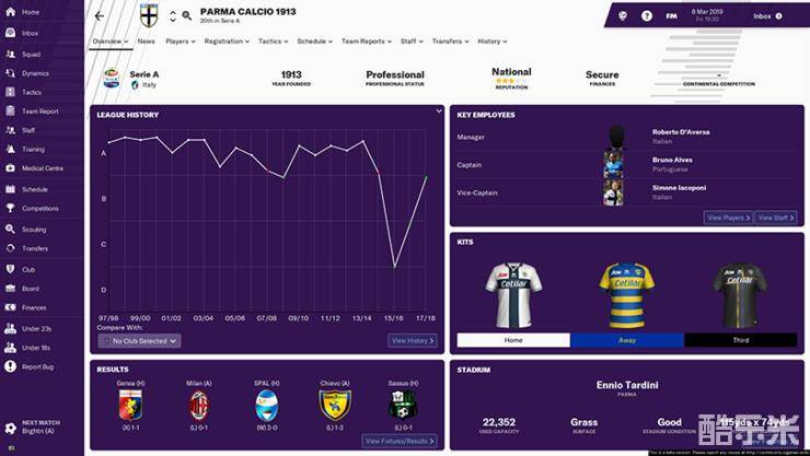 在90年代,帕尔马曾是最著名的球队之一,但自那以后球队因经营不善沉沦已久。在2015年,帕尔马偿还了破产债务,以“Parma Calcio 1913”之名浴火重生。球队完成三级跳,终于回到了意甲。不过问题也就在这。