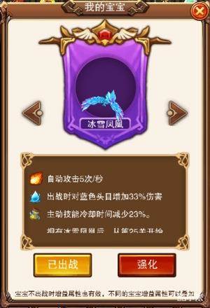 晶莹剔透的冰雪凤凰看上去似乎冷冰冰的,不近人情,带点孤傲。实则不然,只要你召唤了它,它将助你一臂之力。冰雪凤凰如其名,它攻击时会喷出一颗颗冰锥,攻击速率达到每秒5次。出战时还会对蓝色BOSS头目增加33%的伤害,能使你的主动技能冷却时间减少23%哦。并且拥有冰雪凤凰后,从25关开始,每突破20关都可以获得大量金币和银币。