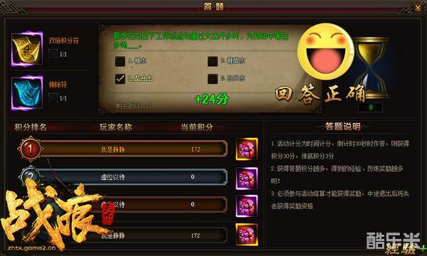 趣味答题是哥们网《战痕天下》玩家们喜闻乐见、老少适宜的系统玩法,在限定时间参与答题选出答案,不管正确与否都会获得积分,当然,作答越快、越准确,获得的积分越高。在答完题目后,系统会根据排名奖励,前三名会获得状元、榜眼、探花宝箱,其余参与的玩机都有答题礼包送上。