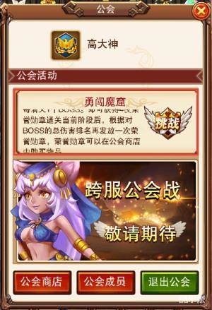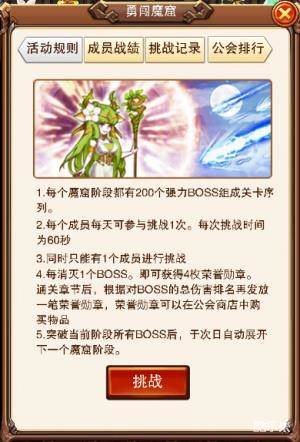 在勇闯魔窟界面,你可以查看公会成员的战绩,看你是否鹤立鸡群;你也可以查看挑战记录,对比成员的关卡高低;还有一个总体的公会排名,孰强孰弱,一目了然。