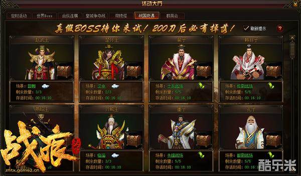 哥们网《战痕天下》的BOSS分为帝王和圣人两种,时间一到,分别有6位圣人和6位帝王出现在《战痕天下》的战场和城中。玩家在战国奇遇页面点击云彩直接传送到帝王所在场景,点击传送符直接传递到圣人所在战场。