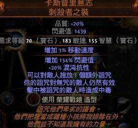 选择这件衣服,要的就是诅咒中毒的属性,这样大家应该知道我们如何做到每次必中毒了吧!配合刺客进阶的暴击100%毒伤,在被敌人打死之前先毒死敌人,这就是我的目标!