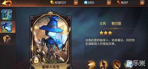接下来是三星士兵稻草人先生,是智力型士兵,免疫魔法,同时也会清除敌人的增益效果。被动技能,铁锈毒矛,攻击敌人时会导致其中毒,造成持续魔法伤害,并降低移速。最后是一个7级的统帅技能—元素祝福,高等级的统帅技能,效果也是不会差的。