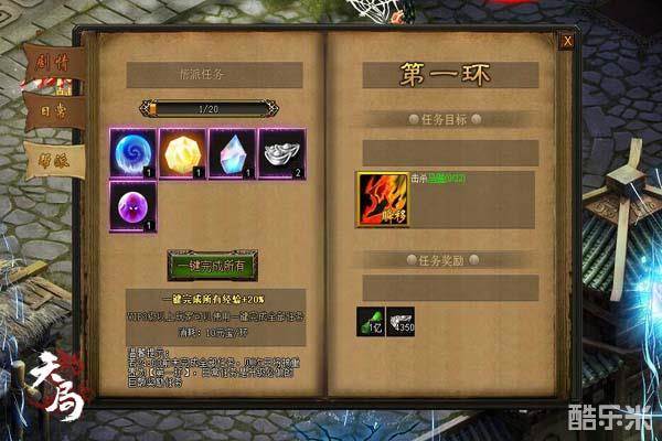 萌乐网《天局》当中,玩家每天可以完成20个帮派任务。帮派任务要求玩家击杀各类怪物。根据玩家等级的不同,需要击杀的怪物也不同,但是击杀难度不会高于玩家实力。玩家可以通过帮派任务界面直接瞬移至怪物身边。帮派任务每天24点刷新,如果24点前没有完成全部任务,则次日任务重置。你也可以消耗元宝快速完成日常任务。