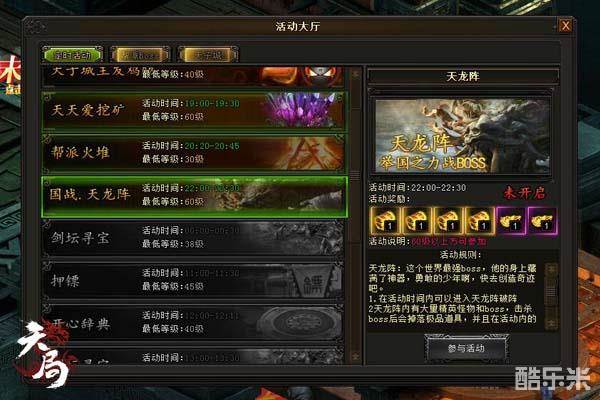 萌乐网《天局》中,玩家达到60级后可以在每天22:00-22:30参与国战天龙阵活动。活动地图内一共有两个天龙阵,每个天龙阵内都有大量精英怪物与BOSS存在。击杀BOSS之后会掉落丰厚道具奖励,在活动地图内的所有玩家都可以获得一个超级奖励箱。如果玩家们齐心协力斩杀了最强的天龙BOSS,则可以获得国战天龙阵中最丰厚的宝箱奖励哦!