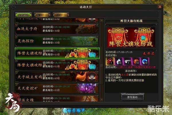 萌乐网《天局》当中,41级以上并且加入阵营的玩家可以在每天17:00-17:15与18:00-18:15两个时间段参加阵营大旗攻防战活动。活动开启后,玩家需要前往敌对阵营城堡门口砍掉敌对阵营的旗帜,或者防守住己方旗帜。小编建议一般的玩家抱紧其他高玩大腿,大家齐心协力守住自己的旗帜并向对方阵营进攻!