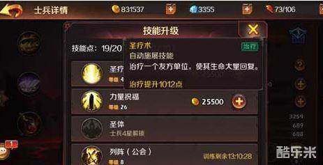 在单体治疗和属性提高上,圣武士都是非常强的。在技能点点上去之后,圣疗术的回复相当可观,残血奶满都是简单的事,力量祝福可以提升阵容的战力,而且还能持续60秒。在公会训练后,可以激活公会技能列阵,增强圣武士的防御,算是个全能型的辅助士兵。