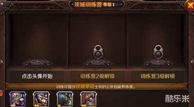 攻城训练营是公会升级之后才有的设施,需要公会的玩家合力努力才有的结果。一般人员较少,活跃度不高的公会都难以有很齐全的公会设施。攻城训练营的作用是训练攻城单位,提升攻城单位的公会技能熟练度,提高攻城效率。在训练营3级后,解锁所有训练位置。