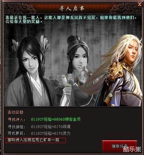 首先需要接取游戏中的寻人启事任务,在游戏界面右上角有个小图标哦。点击寻人启事的图标,接取任务,每天可以接10次寻人任务。此活动全天都可以参加哦。很方便吧!任务领取后将会在随机地图刷出对应的NPC,NPC只对自己可见,所以只能自己上啦。选择其中一位NPC接取任务后,会提示该NPC的所在地图方位。到达相应的地图寻找NPC所在的坐标就可以领取奖励咯。