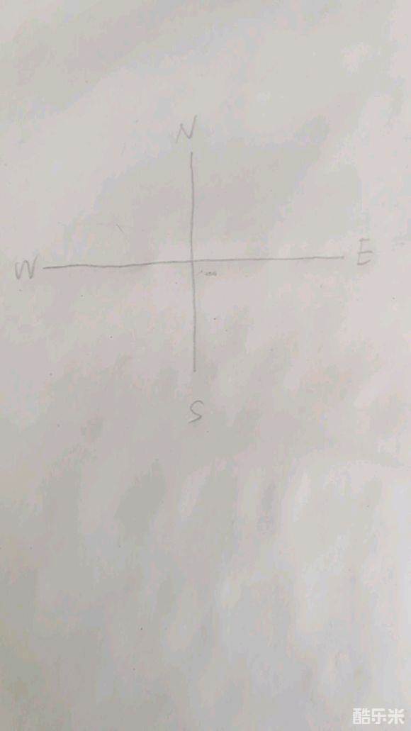 然后,在纸上画下一个简易的坐标系。在四端分别标注n、s、w、e。