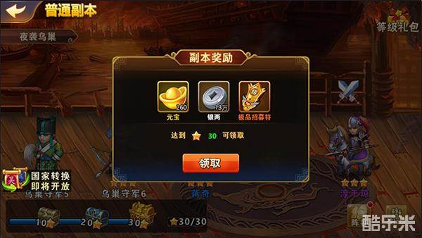 普通副本每章分为10个关卡,每个关卡根据通关完美度获得1-3星,所有关卡星级总和将会显示在该章节左下角。每达到10/20/30星可打开对应宝箱获得对应奖励,里面可有大量的元宝、银两、进阶珠、橙色招募令,这些都是提升武将战力最珍贵的道具。因此我们应当尽量以3星通关,想要三星通关,可就需要一定技巧了。