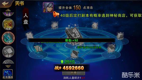 天书碎片可点亮主角天书属性,大幅度提高主角及全队属性,还可将主角进化,最高可进化至红色!!!