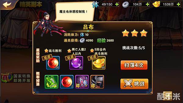 精英副本是普通副本通关后开启的对应高难度副本,每章关卡都是由普通副本的BOSS关卡组成,难度较高,但是对应的通关后的掉落也十分诱人。这里能固定产出大量的经验书、进阶珠、装备碎片、武将碎片,玩家根据自己需要选择性的扫荡精英副本。每个精英副本关卡可扫荡5次,可以通过重置功能增加扫荡次数,快速获取玩家所需。