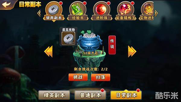 日常副本可获得大量日常消耗道具,所以请记得每天都要来挑战。日常副本分为不同的难度等级,难度越高掉落数量也就越多,但是高难度等级需玩家达到一定等级且前一难度等级通关。