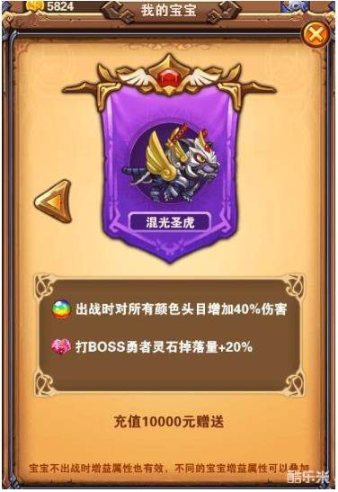 除了初始的宝宝小弱鸡之外,《不服小天王》里还有更多实力强劲的宝宝,而且这些宝宝都有各自的专属属性,比如黑龙能够将宝宝的攻击力和勇者攻击力提升10%,拥有冰雪凤凰后在第25关开始,每突破20关后都能获得大量的金币。游戏中还有混光圣虎,七域骨龙这样的强力宝宝,需要充值达到指定数额即可获得。